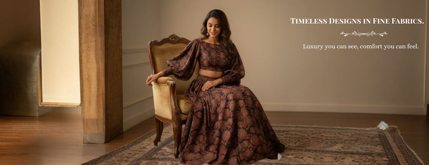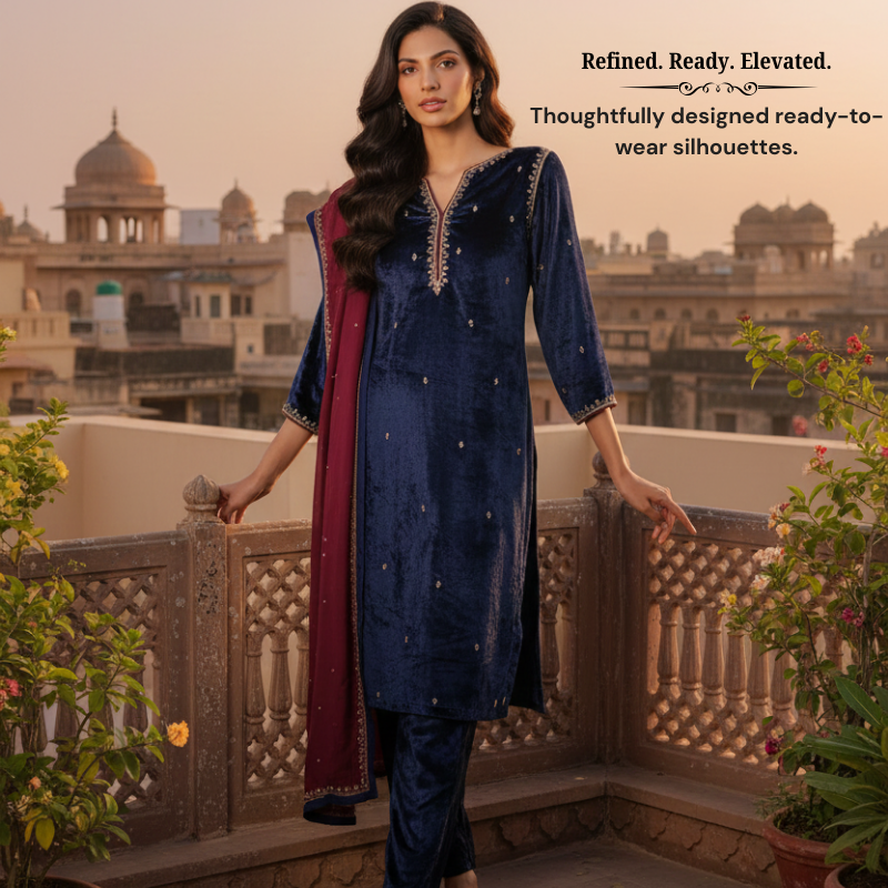 Our thoughtfully curated collections celebrate craftsmanship and timeless elegance, featuring silk blends, breathable cottons, soft muslins, and luxurious velvets—chosen for their beauty, comfort, and lasting appeal.